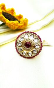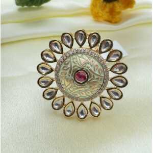 Designed in a traditional floral motif, the ring features mirror-finished kundan stones arranged around a pastel enamel center, highlighted by a deep red stone at the heart. The intricate meenakari detailing and antique gold plating make it a perfect choice for weddings, festivals, or special occasions.