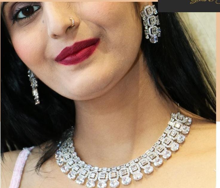 AERAN Make a glamorous statement with this sparkling necklace set, adorned with dazzling American diamonds in a geometric arrangement. Paired with matching drop earrings, this piece adds refined elegance to both modern and traditional ensembles.